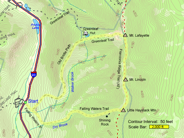 The trailhead is located directly off I-93 across from Lafayette Campground. It is clearly marked, and you will be able to navigate directly to it with the map below.