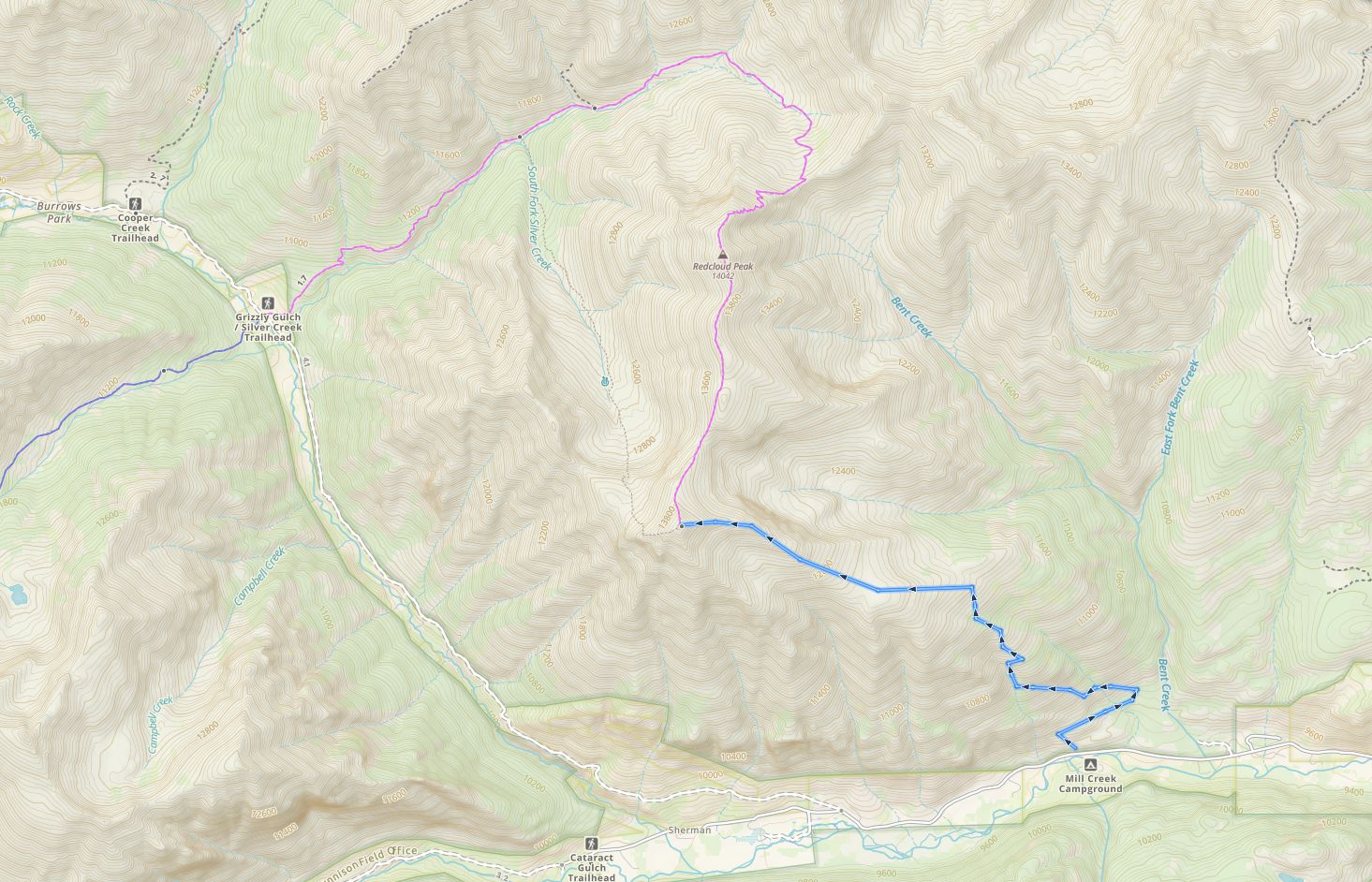 This route starts from the Silver Creek / Grizzly Gulch Trailhead at 10,420 feet and follows the same directions as above, but hikers simply turn around at the summit of Redcloud.
